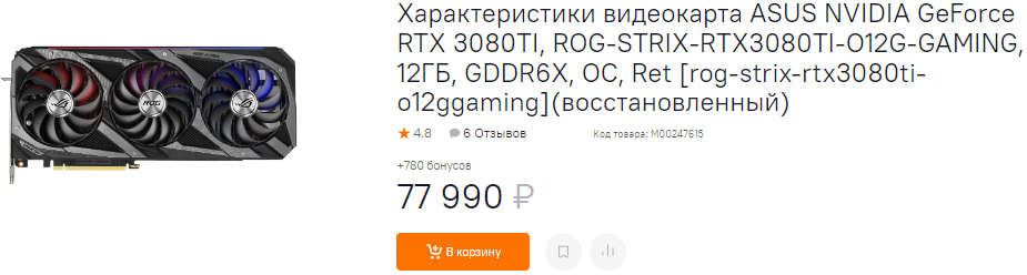 Судя по всему, определяющим фактором в вопросе цены отремонтированных видеокарт считается срок гарантии. К примеру, есть GeForce RTX 3080 Ti за 78 тысяч рублей. Эта видеокарта медленнее указанного выше флагмана и имеет меньше видеопамяти, но стоит дороже только потому, что гарантийные обязательства будут действовать ещё два года. Кстати, сегодня за новую GeForce RTX 3080 Ti у вас попросят около 100 тысяч рублей, ну а здесь почти новая видеокарта, которая была восстановлена специалистами. Узнать её историю нет никакой возможности, но нам кажется, что это выгодное предложение, позволяющее неплохо сэкономить.