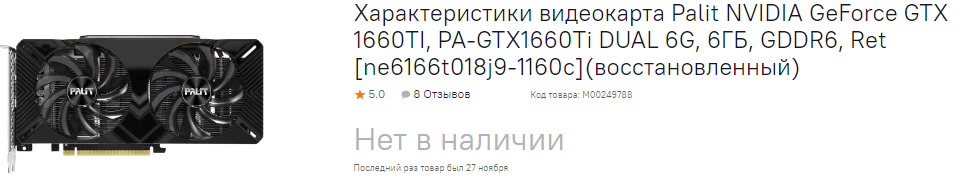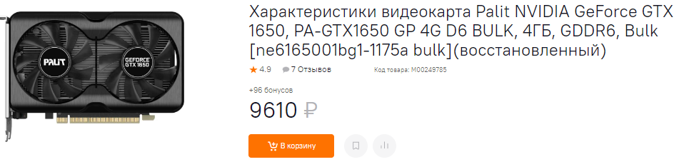 Когда мы начали писать данный материл, то было выгодное предложение по GeForce GTX 1660 Ti, но к моменту оформления новости карту уже купили. Вот так-то, не стоит щёлкать клювом, ведь есть масса тех, кто делает правильный выбор. Ну и завершить хотим на GeForce GTX 1650. Обычно, такая видеокарта стоит около 14-15 тысяч рубликов. Это немного, но далеко не все способны позволить себе потратить такую сумму. Времена нынче тяжёлые, но выход есть, ведь вы получаете вполне годную модель производства Palit с немалой выгодой. С гарантией всё плохо, ведь на видеокарту магазин даёт всего месяц. Именно поэтому мы всё же советуем подумать. Ну а если вы собрали всего 10 000, а больше ну просто никак, то вариантов у вас нет.