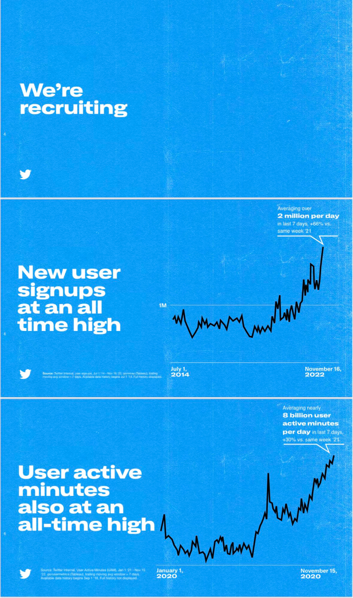 Помимо этого на одном из слайдов виден текст: «We`re recruting(Мы набираем сотрудников)», что говорит о расширении штата Twitter после его недавнего массового сокращения, в ходе которого половина сотрудников покинули команду социальной сети.