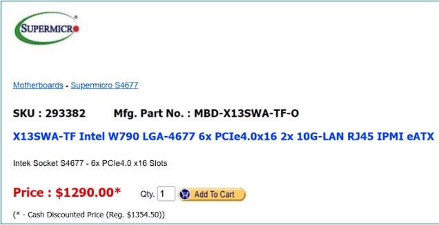 Эта новость появилась из листинга канадского ритейлера, известного как ATIC. На этом сайте была размещена страница материнской платы SuperMicro X13SWA-TF на базе чипсета Intel W790, которая еще не была официально анонсирована. Плата оснащена сокетом LGA 4677, шестью слотами PCIe 4.0 x16, парой портов 10-Gigabit Ethernet и упаковано все это в форм-фактор eATX.