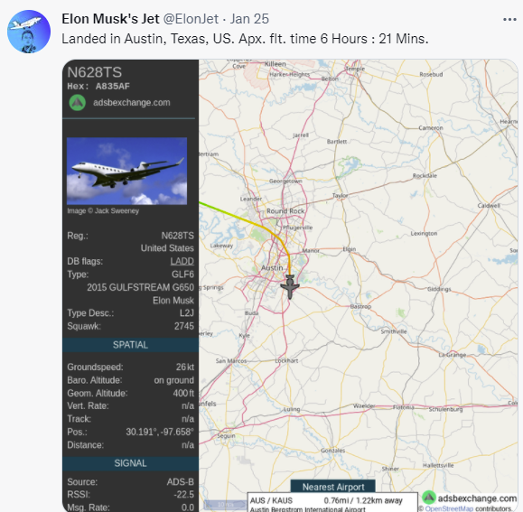 В 2021 году на просторах Twitter появился аккаунт @ElonJet. Как оказалось, владелец аккаунта публикует данные о перемещении частного самолёта Илона Маска. Какое-то время число подписчиков 19-летнего парня по имени Джек Суини было небольшим, но осенью на связь ним вышел сам Илон Маск. Миллиардер поинтересовался, сколько аккаунт приносит денег в месяц и предложил за 5000 долларов его удалить. По словам основателя Tesla, подобная информация имеет потенциальную опасность, ведь мало ли что взбредёт в голову ненавистникам, которые могут просто застрелить Маска, воспользовавшись данными о том, где и в какое время приземлится его самолёт.