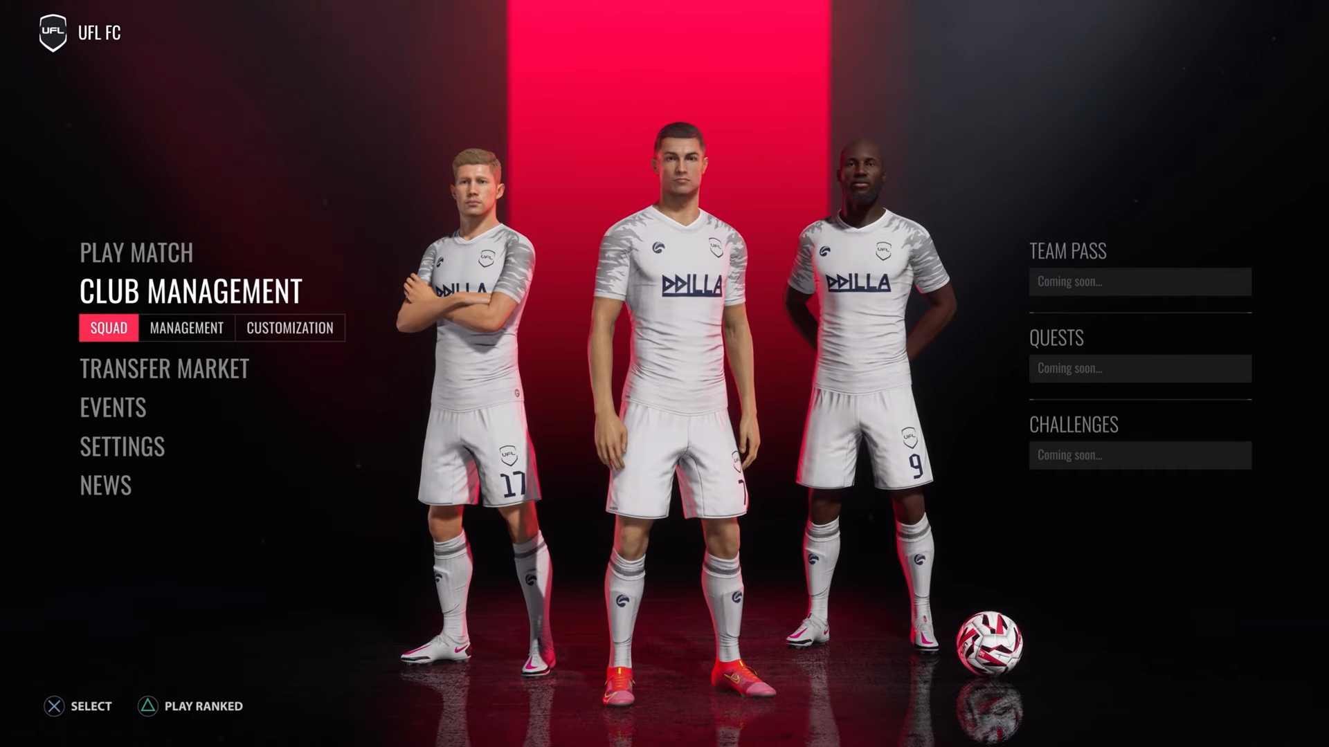Нам также показали интерфейс игры, который ещё стоит доработать. Интерфейс сделан в брутальном чёрном цвете и выглядит достаточно современно. На главном экране нас встречает несколько вкладок: запуск матча, управление клубом, трансферы, события, настройки и новости. А также справа можем наблюдать прогресс Team Pass (местный аналог Battle Paas), прогресс различных заданий и челленджи, чтобы не было скучно.