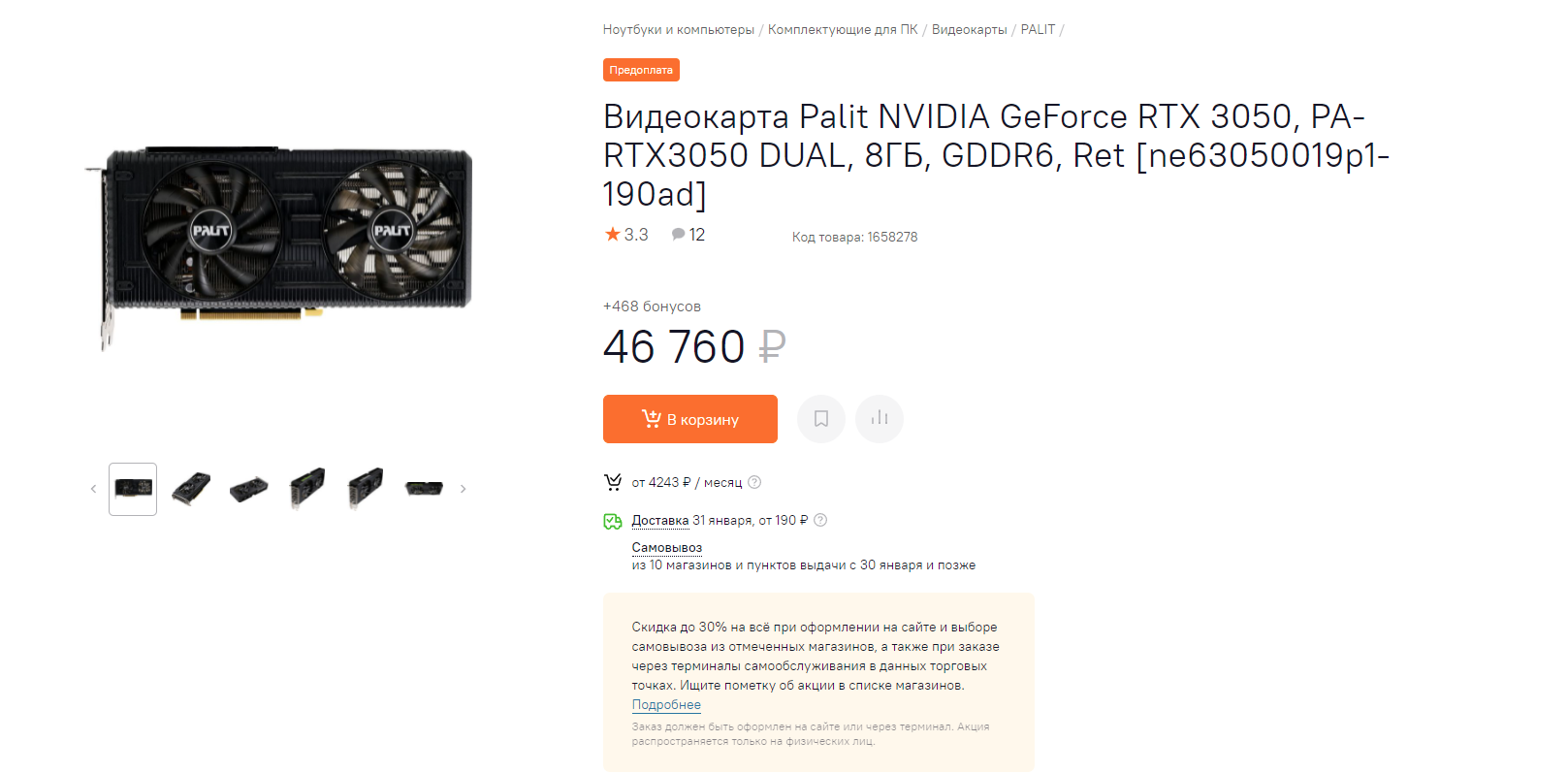 Как заведено уже достаточно давно, заранее узнав характеристики и ожидаемые цены на RTX 3050, многие пользователи поспешили поделиться своим мнением на многочисленных форумах о полной бессмысленности данной модели "за эти деньги". Возможно в чём-то они и правы. Но реальность показала немного обратную картину - все появившиеся сегодня в российских магазинах видеокарты RTX 3050 были полностью раскуплены, причём по очень далёкой от рублёвой рекомендованной цене (24990 рублей). Тем не менее в некоторых магазинах новинки периодически вновь высвечиваются как доступные к покупке. Это либо результат продажи дозированными партиями, либо следствие отказов от необдуманных предзаказов или влияние других факторов. Но нам это даёт нам возможность увидеть реальные цены на RTX 3050 в отечественной рознице, не опираясь при этом на слухи.