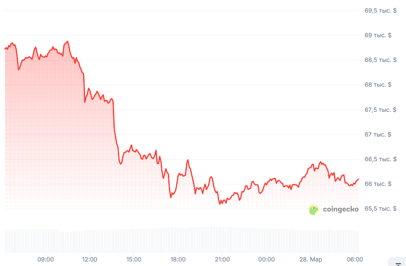 В пятницу, 27 марта, цена Bitcoin (биткоина) упала до самого низкого уровня за более чем две недели. Цена опустилась ниже отметки в 67 000 долларов, в то время как Ethereum приблизился к отметке в 2000 долларов. В субботу утром падение продолжилось и цена первой криптовалюты опустилась до отметки в 66 000 долларов.