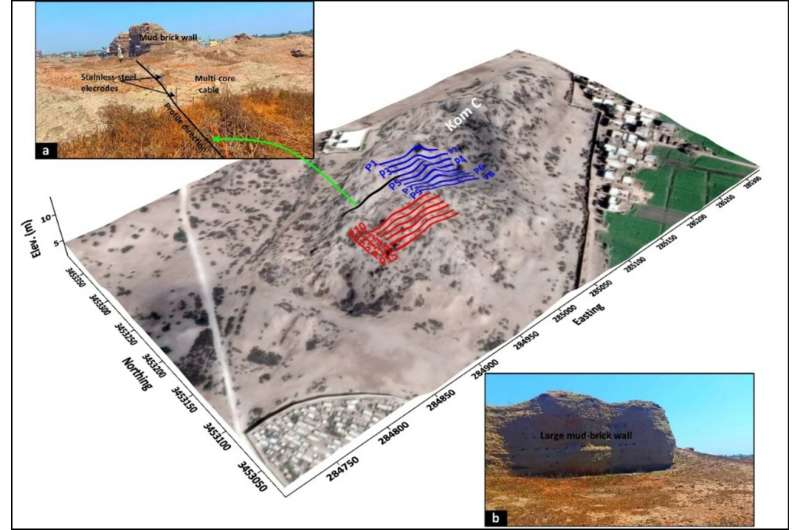 На глубине от трех до шести метров приборы зафиксировали четкую структуру саитского периода, что позволяет предположить, возведено оно было возрастом приблизительно 2600 лет назад. Исследователи предположили, что это может быть крупная гробница или святилище. Ради проверки они вскрыли участок 10 на 10 метров и там, где датчики показали стены, нашли сырцовый кирпич и религиозные артефакты. Авторы исследования теперь планируют расширить эти изыскания, используя более крупное оборудование, чтобы достичь еще более глубоких и древних уровней.