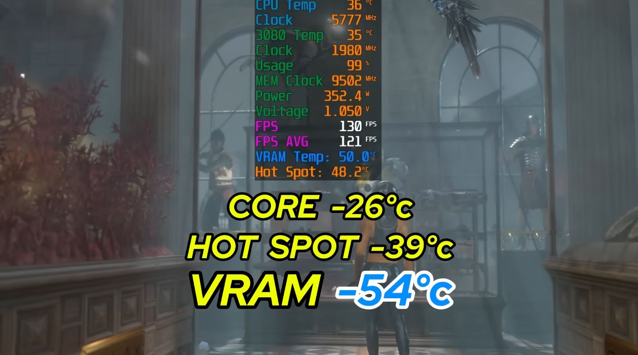 Результат того стоил. В 3DMark Time Spy температура ядра упала на 26 градусов, а память — с 104 до 50. Разница в 54 градуса. После ручного разгона карта прибавила 195 МГц к частоте ядра, что дало прирост производительности около 9% по сравнению со стоковой версией с воздушным охлаждением.