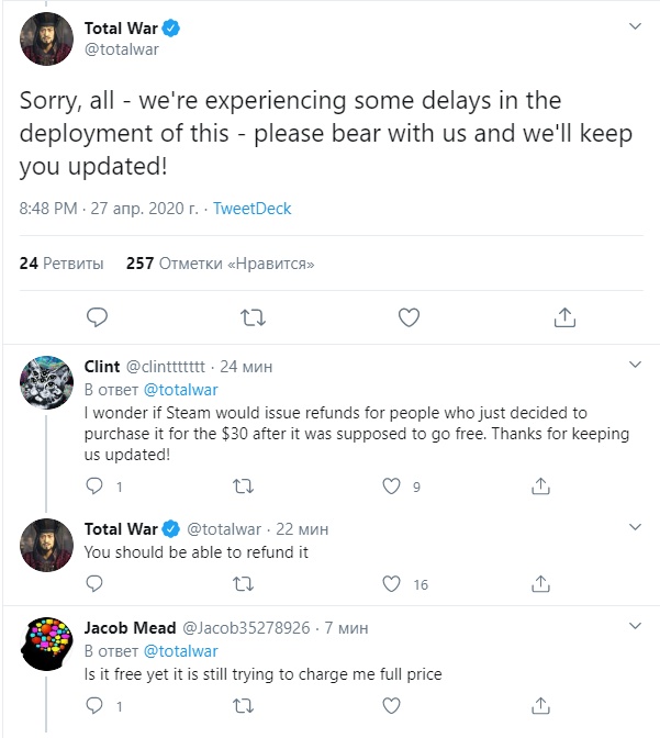 В итоге Sega не выдержала столь серьезного числа негативных и публично извинилась перед всеми игроками в своем Twitter от имени аккаунта франшизы Total War.