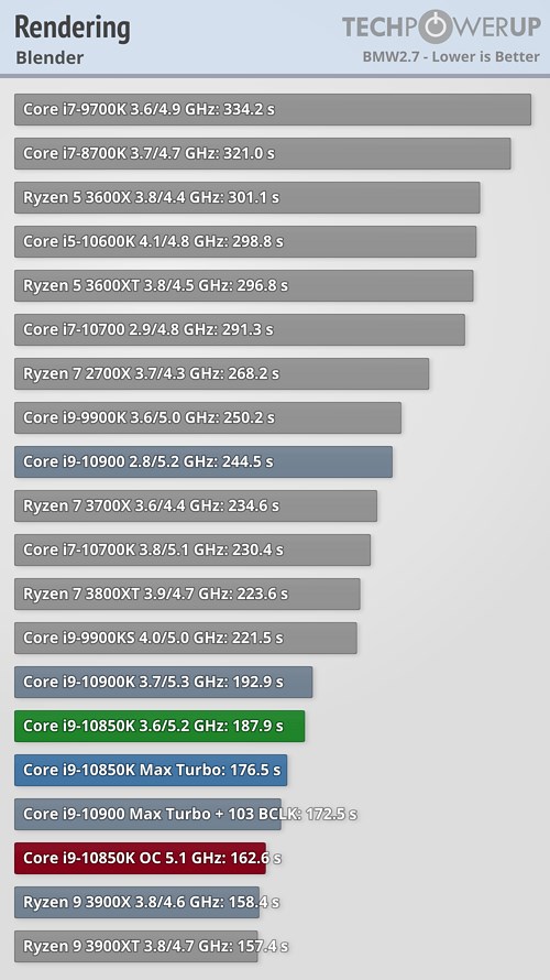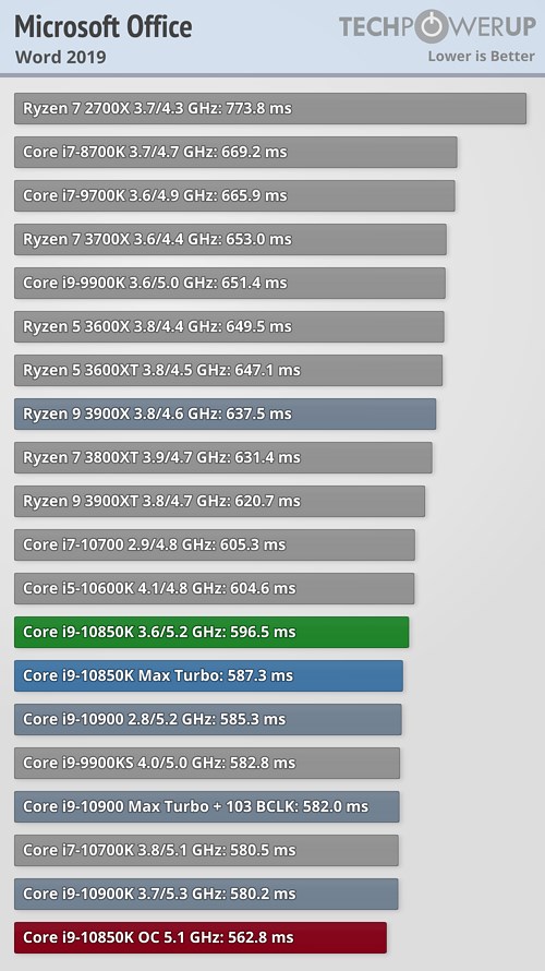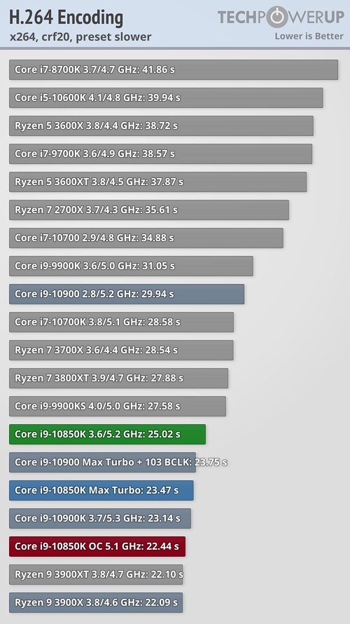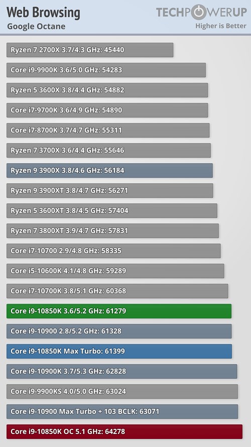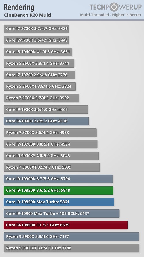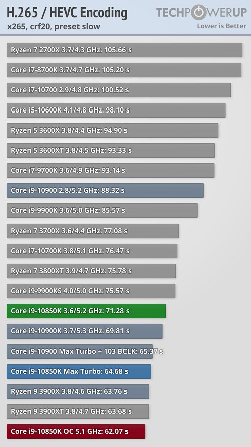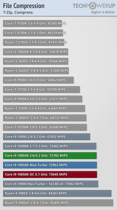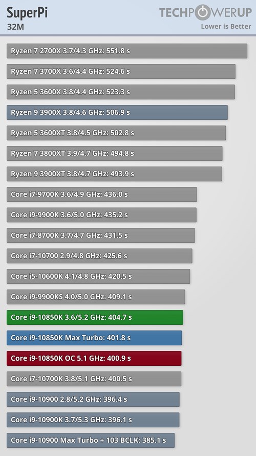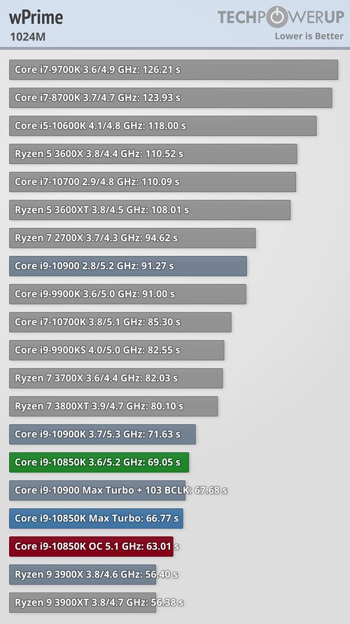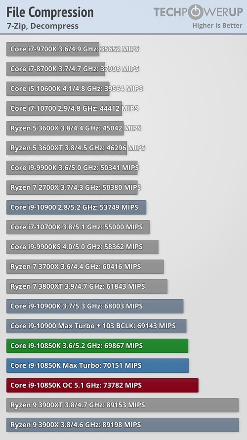 В прикладных задачах и синтетических тестах процессор Core i9-10850K продемонстрировал не слишком большое отставание от своего «старшего брата» в лице Core i9-10900K, подчас даже обгоняя его, а разгон до 5,1 ГГц позволил новинке оторваться от флагманского продукта в большинстве случаев, причём разрыв в некоторых сценариях оказался достаточно существенным.
