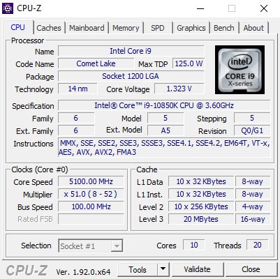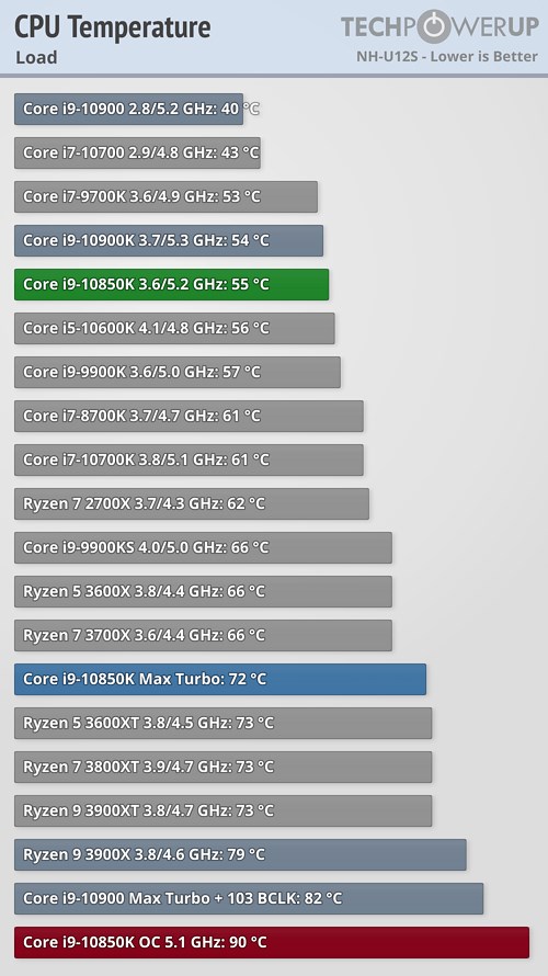 Температурные показатели Core i9-10850K в стоке практически не отличаются от Core i9-10900K, а при разгоне до 5,1 ГГц (1,323 В) при активности всех ядер достигают значения в 90 °C, что, несомненно, требует качественной системы охлаждения.