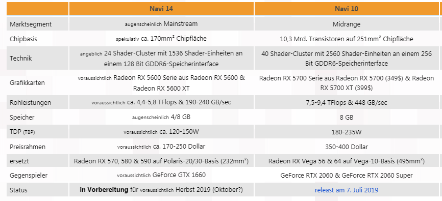В сводную таблицу, содержимое которой обработала безжалостная машина перевода Google, попали основные прогнозируемые источником характеристики Navi 14 и Navi 12. По мнению немецких исследователей, видеокарты на базе Navi 12 заменят собой уходящий со сцены Radeon VII, а выйдут они не в октябре, а чуть позже этой осенью, либо зимой. Конечно, это лишь прогнозы неофициального источника, они не могут приниматься за истину в дальнейших рассуждениях на эту тему.