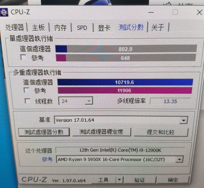 Согласно представленной информации, топовый десктопный процессор Intel Core i9-12900K, располагающий 24 потоками и функционирующий на стандартных частотах, в однопоточной дисциплине смог заполучить 802.9 балла, обогнав своего конкурента из стана AMD в лице Ryzen 9 5950X на 23.9 %, а в многопоточном состязании сумел завоевать 10719.6 очка, отстав от своего соперника, оснащённого 16 ядрами/32 потоками, на 10.0 %.