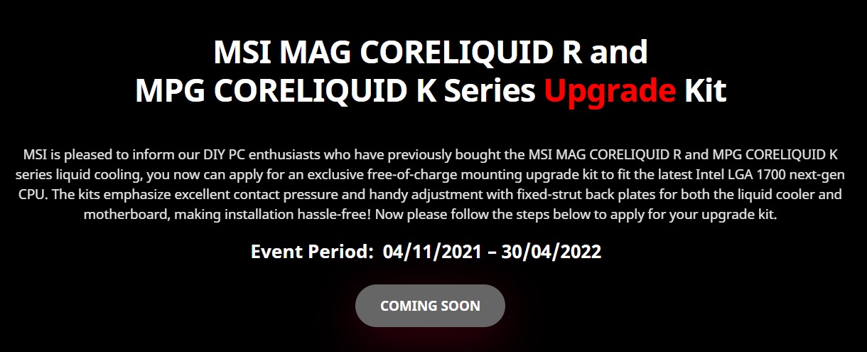 Как сообщает источник, несколько часов назад MSI уведомила владельцев систем жидкостного охлаждения серий MAG CORELIQUID R и MPG CORELIQUID K о возможности их обновления бесплатными наборами креплений, предназначенными для разъёма Intel LGA 1700 – заявки принимаются с 4 ноября текущего года по 30 апреля следующего.