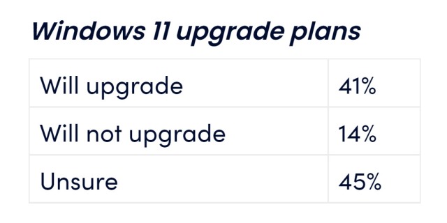 Что касается желания пользователей переходить на Windows 11, то лишь 41 % опрошенных твёрдо убеждены в целесообразности данного мероприятия и перейдут на свежую версию ОС, в то время как 45 % пока не уверены, оправдывает ли данная затея потраченного на неё времени, а 14 % респондентов высказались о своём нежелании обновляться.