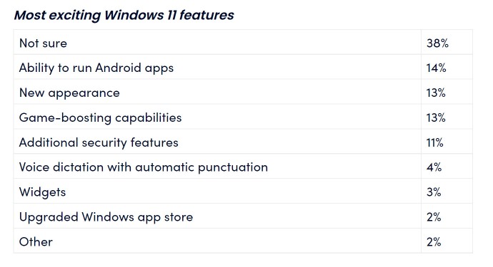 Не менее интересен тот факт, что более трети опрошенных (38 %) не смогли объяснить, какая именно функция Windows 11 прельщает их больше всего, 14 % респондентов в восторге от способности запускать Android-приложения, 13 % участников опроса рады новому дизайну и расширенным игровым возможностям, а 11 % пользователей находят полезными дополнительные меры безопасности.