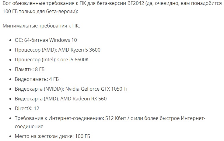 В августе DICE уже публиковала системные требования для тестовой версии Battlefield 2042, и обычно данные параметры в видеоиграх остаются неизвестными и к их полноценному релизу. Но в случае с Battlefield 2042 правило не сработало, и DICE скорректировала системные требования уже в бета-версии проекта, о чём официально сообщила вскоре после оглашения сроков проведения открытого тестирования.