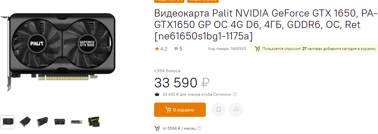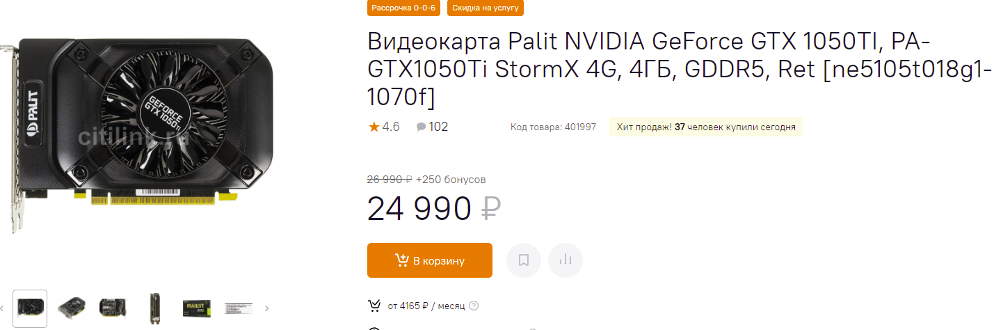 А вот геймеры покупают GeForce GTX 1650. 30% прирост производительности по сравнению с GeForce GTX 1050 Ti даёт о себе знать, но платить за такое чудо технологической мысли придётся 33 590 рублей. 27 человек решили, что это выгодное предложение. Не будем с ними спорить, ведь видеокарта действительно способна решить проблему запуска современных игр, хотя делает это и на средних настройках графики в 1080р.