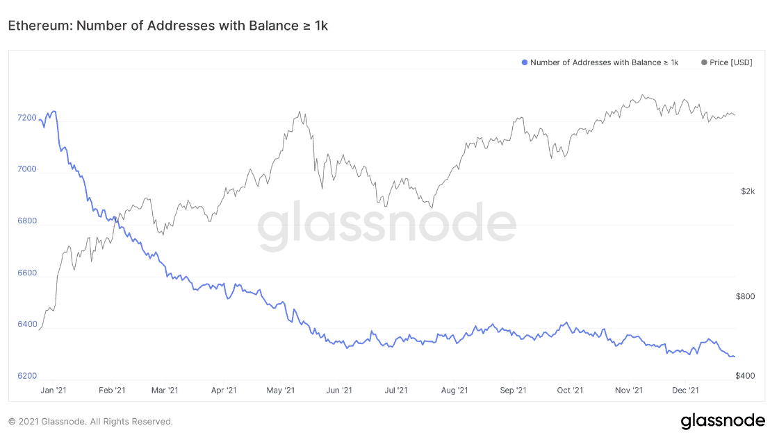 По данным аналитиков Glassnode, в последнюю неделю количество китов, на чьих счетах имеется больше тысячи монет Eth, сократилось до 6292. Специалисты Glassnode подчеркивают, что это самый низкий уровень с апреля 2017 года. При этом, еще в начале уходящего года число крупных держателей составляло 7239 человек. Следствием этой распродажи стало падение курса цифровой монеты ниже 3800 долларов за токен.