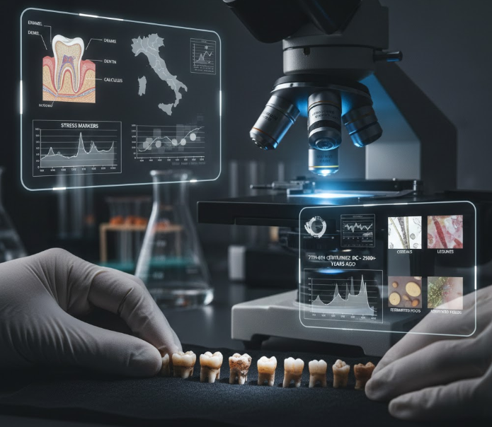 На изображении: A: Местоположение Понтеканьяно; B: Зубные образцы; C: Гистологические снимки двух исследуемых зубов с соответствующими линиями стресса (Accentuated Lines).; D: Микроскопические снимки остатков, извлечённых из зубного камня. Источник: https://scitechdaily.com