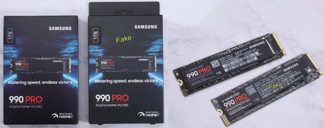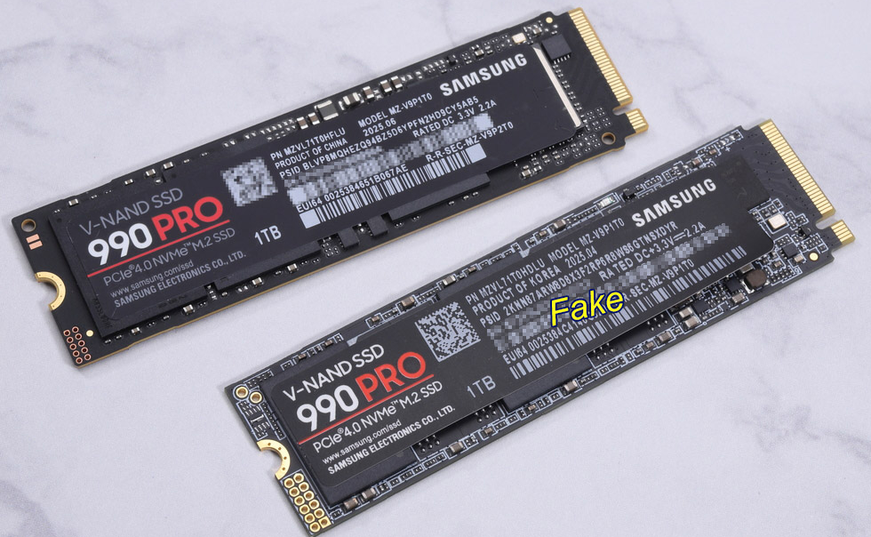Японская компания AKIBA PC Hotline опубликовала отчет о поддельном SSD-накопителе Samsung 990 PRO, который гораздо сложнее распознать, чем обычные поддельные SSD. Сообщается, что накопитель поставляется в практически идентичной упаковке, имеет маркировку 990 PRO и даже определяется Windows и CrystalDiskInfo как 1-терабайтный Samsung 990 PRO, работающий через интерфейс PCIe 4.0 x4.