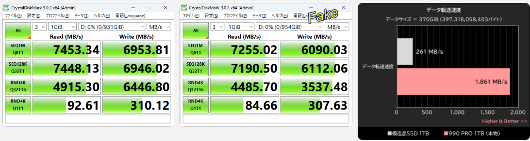 Отличие данного случая в том, что поддельный накопитель не проходит обычные экспресс-проверки. По данным AKIBA, тест CrystalDiskMark показал скорость чтения до 7255 МБ/с и скорость записи до 6090 МБ/с на поддельном накопителе, что достаточно близко к официальному заявленному Samsung показателю скорости чтения в 7450 МБ/с и записи в 6900 МБ/с.