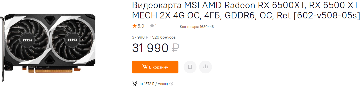 На момент своего выхода на российский рынок Radeon RX 6500 XT получила рекомендованную цену в 27 000 рублей. Вот только вместо этого мы увидели, как торговые сети начали накручивать тысячи, а в итоге купить бюджетный графический чип дешевле 35 000 рублей было невозможно. Сегодня стоимость крайне противоречивой видеокарты впервые с момента продаж в РФ приблизилась к рекомендованной. Карта немного уступает GeForce GTX 1660, вынуждая своего владельца бороться с драйверами и настройками, но нам она кажется лучшим предложением в нашем списке с точки зрения цены и производительности. Задумайтесь о покупке модели производства MSI. Она тихая и имеет неплохой запас по температуре. В результате во многих случаях вы вообще не будете слышать гул кулеров.