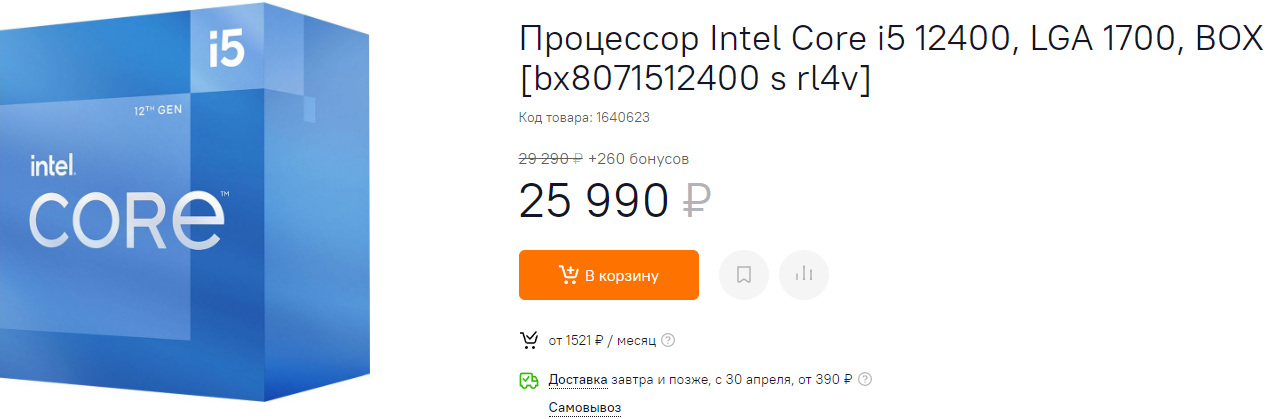 Прежде всего хотим обратить ваше внимание на Core i5-12400. Он идеален для новой сборки, предлагая отличную производительность в играх и рабочих задачах. До уровня флагманов ему далеко, но покупая такой камень, вы получаете бесплатный кулер и вольны взять недорогую материнскую плату. В комплекте со среднебюджетной видеокартой Core i5-12400 покажет себя с лучшей стороны, а владелец компьютера не будет испытывать проблем с запуском любых игр в 1080р и 2К.