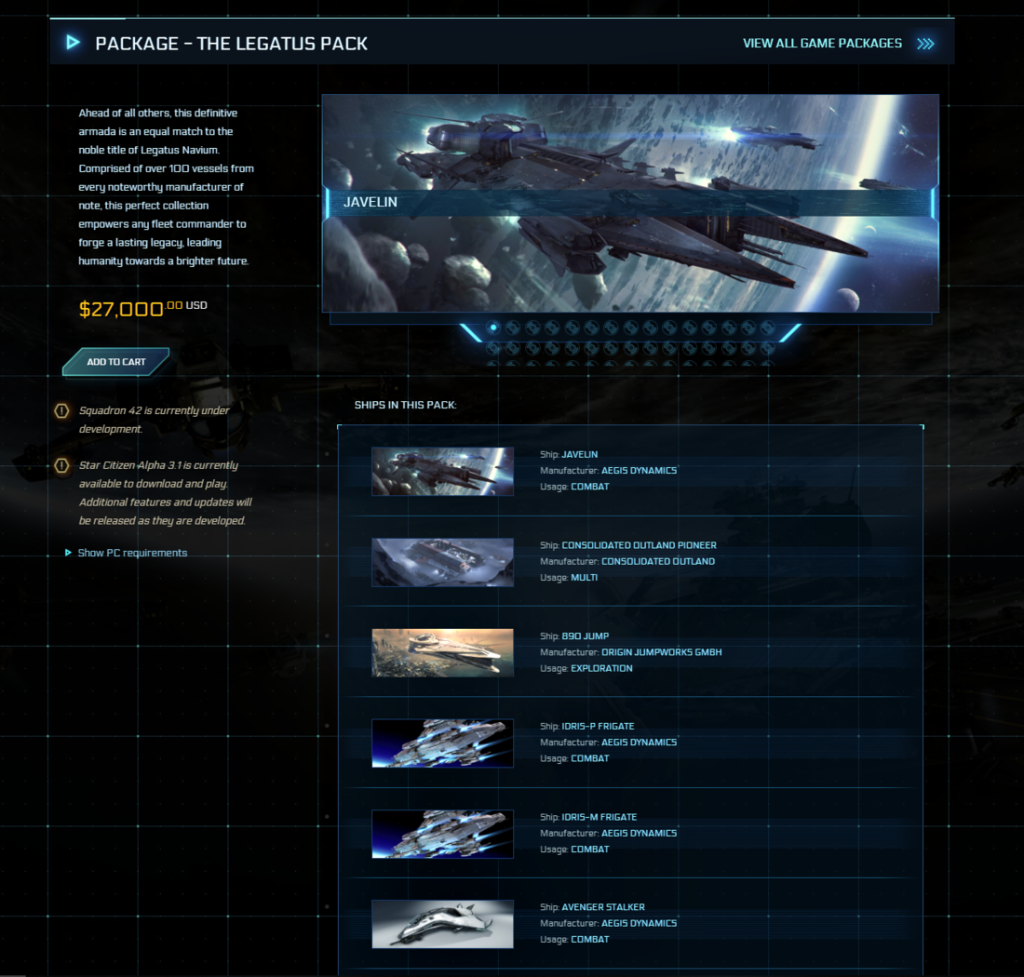 Разработчики космического симулятора Star Citizen преподнесли для фанатов игры настоящий сюрприз: новый набор The Legatus Pack, включающий в себя почти весь игровой космический флот в размере 117 кораблей, а также дополнительные 163 предмета, среди которых различные скины, улучшения, а также иные бонусы, теперь доступен для всех желающих за какие-то $27 тыс. Если вы перешли по ссылке и ничего не обнаружили, то не удивляйтесь: чтобы увидеть новый набор, вам необходимо дополнительно потратить в игре $1000. Полный список доступных «плюшек» можно увидеть на форуме.