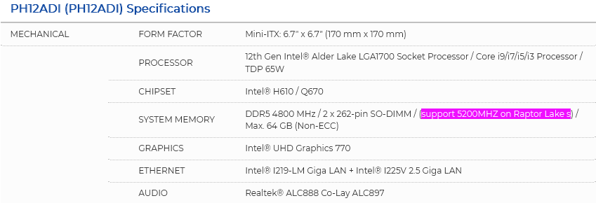 На сайте производителя появилась промышленная материнская плата PH12ADI Mini-ITX, в её спецификации указана поддержка процессоров Raptor Lake-S вместе с оперативной памятью формата SO-DIMM DDR5-5200. Возможно, это самая низкая частота, изначально поддерживаемая Raptor Lake для памяти SO-DIMM, для стандартных модулей скорость может быть выше. Стоит отметить, что плата предлагается на чипсете H610 или Q670, ранее инсайдеры утверждали, что Raptor Lake-S будет совместим с чипсетами 600-серии, причём замена бюджетному H610 вообще может не появиться в 700 серии.