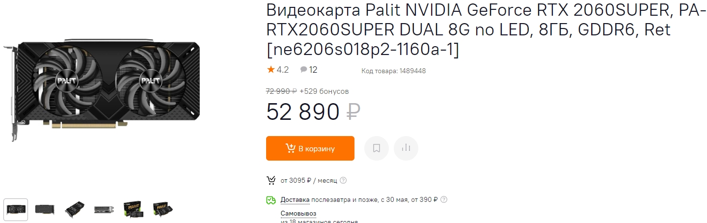 Пожалуй, оптимальным предложением на 29 мая будет GeForce RTX 2060 SUPER. Эта видеокарта почти не уступает GeForce RTX 3060, но стоит намного дешевле. Единственным минусом здесь может быть меньшее количество видеопамяти. Ну а поскольку 8 Гб достаточно для 1080р, то нам кажется, что нет смысла приплачивать. Кстати, в ходе падения курса рубля эта модель не подорожала, а значит у вас есть уникальный шанс купить её с максимальной выгодой.