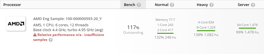 Один из будущих шестиядерных чипов AMD на архитектуре Zen 4 (предположительно Ryzen 5 7600X) превзошел нынешний флагман Intel Core i9-12900K по одноядерной производительности. Тем не менее к результату бенчмарка следует относиться с осторожностью, поскольку это UserBenchmark, а чип AMD является инженерным образцом.