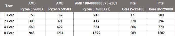 Понятно, что сравнение Ryzen 5 7600X и Core i9-12900K в многопоточном режиме не имеет смысла, так как последний оснащен 16 ядрами и в тесте опередил Ryzen 5 7600X на 99%.