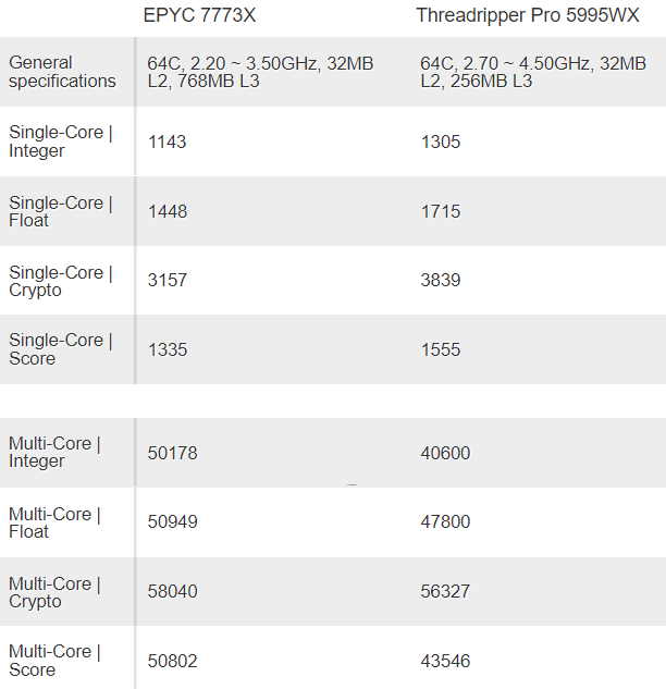 В многоядерных рабочих нагрузках Intel Xeon Platinum 8480+ демонстрирует свой потенциал и превосходит 64-ядерный процессор AMD EPYC 7763. Между тем, он не может конкурировать с 64-ядерным процессором AMD EPYC 7773X, оснащенным 3D V-Cache, а также с Ryzen Threadripper Pro 5995WX, имеющим значительно более высокие тактовые частоты.