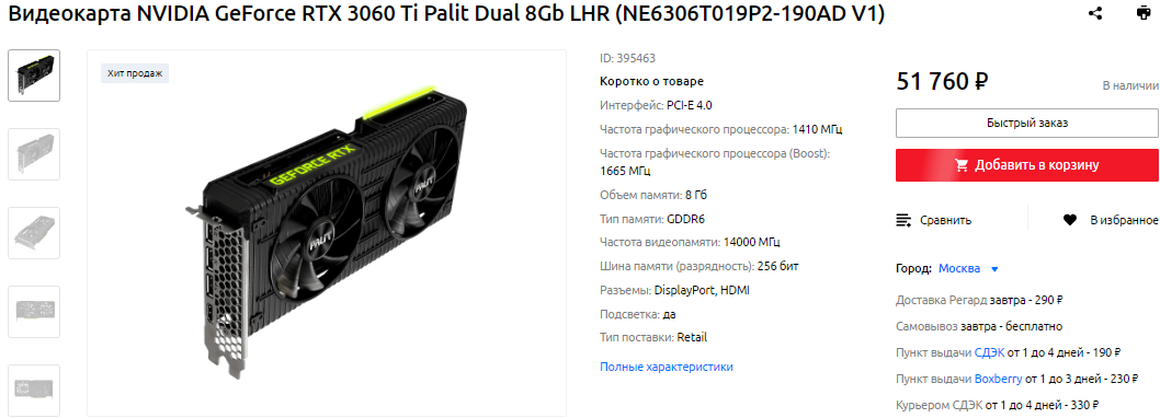 Переход на 2К позволяет ощутимо сэкономить. GeForce RTX 3060 Ti не только стоит дешевле, но и станет идеальным выбором для указанного выше разрешения. В данном случае 8 Гб это даже больше, чем достаточно, ведь мы говорим о разрешении 2К, в котором требования к видеопамяти и в целом к производительности намного ниже. Представленная выше модель от Palit не может похвастать эффективным охлаждением, но и не является плохой. Видеокарта не шумная, хотя в сложных сценах может напоминать о своём существовании.