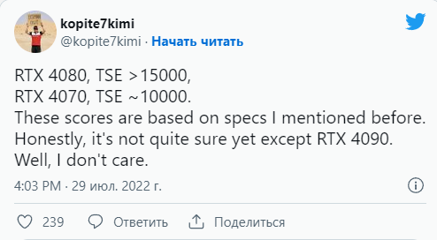 Эксперты полагают, что слухи о невероятной прожорливости графических чипов следующего поколения были верны. Судя по всему, унять аппетиты GeForce RTX 4080 удалось только после обрезки шины до 256 бит, а GeForce RTX 4070 уместить в 300 Вт только с 160-битной шиной. Если судить по опубликованным данным, то это никак не повлияет на конечный результат, ведь количество баллов кажется поразительным. В то же время, всё это может быть очередной порцией фейков. В августе ожидается внеочередная пресс-конференция, в рамках которой Дженсен Хуанг расскажет о новом поколении графических чипов. А пока остаётся только ждать.