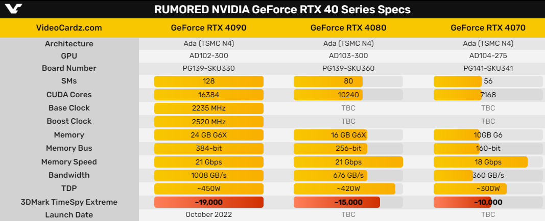 - GeForce RTX 4090. Флагман претендует на гигантский кристалл площадью свыше 600 мм, состоящий из 16 384 ядер CUDA. Инсайдеры отмечают, что будет и больше, но полноценный GPU достанется другому продукту, который выйдет в 2023 году. По видеопамяти изменений не предвидится, а скорость её составит 21 Гбит/с. Теплопакет не превысит 450 Вт, а тактовая частота, несмотря на обещания, не выйдет за пределы 2500 МГц.