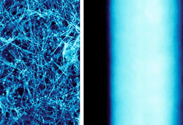 Изображение покрытия из медных нанопроволок (слева) сделанное с помощью сканирующего электронного микроскопа, а также более детальный снимок отдельного сегмента нанопровода. US Department of Energy Ames National Laboratory