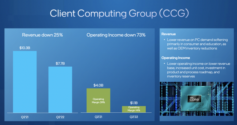 Клиентский сегмент продолжает определять примерно половину совокупной выручки Intel, а он во втором квартале продемонстрировал снижение на 25% в годовом сравнении, до $7,7 млрд. Сразу несколько факторов, если не считать влияние локдаунов в Китае и ситуации на территории Украины, руководство Intel упоминает при объяснении причин такой динамики выручки на направлении ПК. Спрос снизился как в потребительском, так и в образовательном, и в некоторой части корпоративного сегмента рынка. Производители ПК до сих пор не избавились от излишков компонентов, которые сформировали в предыдущие периоды, а потому им теперь не нужны новые партии в прежних объёмах. Впрочем, даже в таких неблагоприятных условиях Intel удалось увеличить среднюю цену реализации процессора на 11%, поскольку спрос сместился в сторону более дорогих моделей.