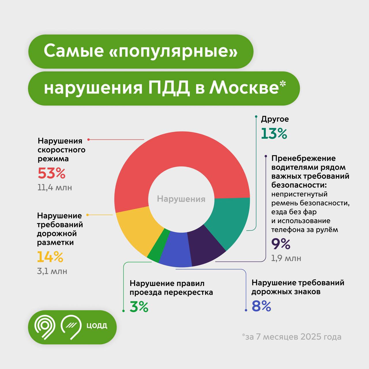 Из них каждое второе нарушение — 53% — это превышение скоростного режима. Абсолютное большинство превышений скорости (98% от всех превышений) — это превышение на 20—40 км/ч. Учитывая, что камеры не выписывают штрафы за превышение скорости на значение меньше 20 км/ч, получается, что 2% от всех «гонщиков» в столице превышают скорость более чем на 40 км/ч.