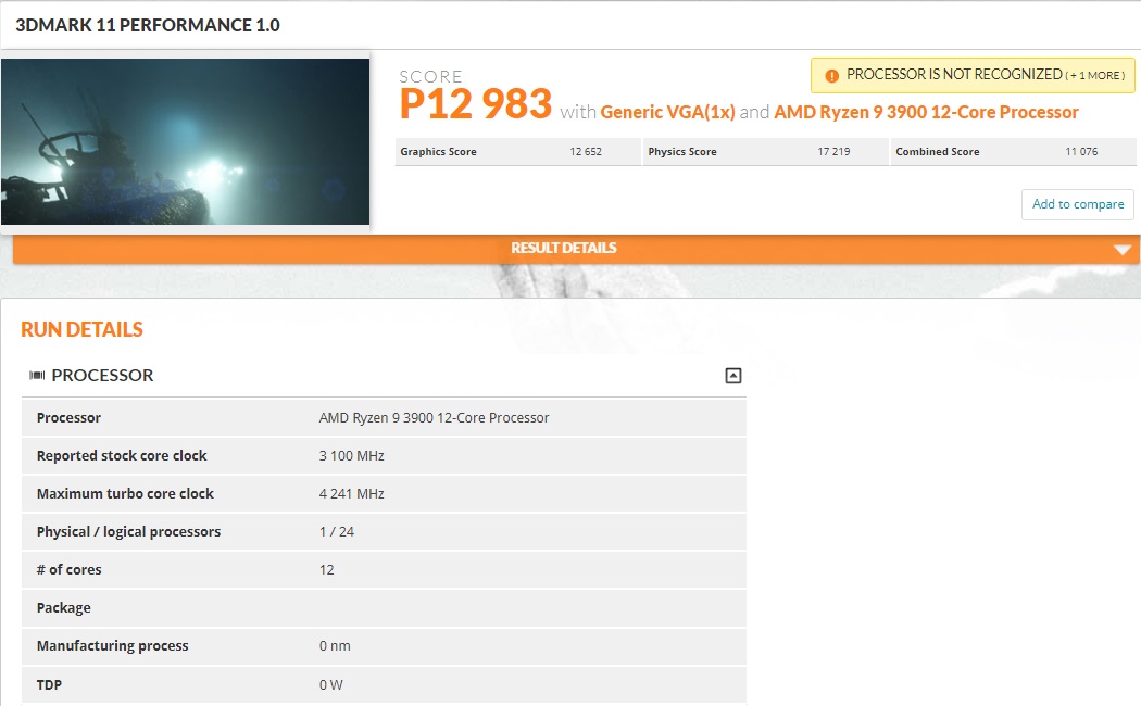 До недавнего времени ходили слухи об ещё одном CPU – 12-ядерном 24-поточном AMD Ryzen 9 3900, однако никаких фактов, подтверждающих реальное существование данной модели, не было. Всё изменилось после появления новинки на официальном сайте Biostar, где были подтверждёны уровень TDP процессора в 65 Вт и нижняя планка частоты в 3,1 ГГц. Теперь же появилось ещё одно подтверждение реальности нового продукта — процессор «засветился» в популярном бенчмарке 3DMark 11 Performance.