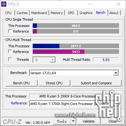 Во встроенном бенчмарке популярной утилиты CPU-Z представленный образец смог набрать 485 баллов в однопоточном режиме и 2872 очка — в многопоточной дисциплине, отстав от своего 8-ядерного 16-поточного собрата Ryzen 7 3700X на 5 % и 49 % соответственно. Что касается заочной борьбы со своим конкурентом из стана Intel в лице Core i5-9400F, то новинка смогла превзойти средний результат соперника на 2-7 % (для одного потока) и 7-12 % (для многопоточной нагрузки).