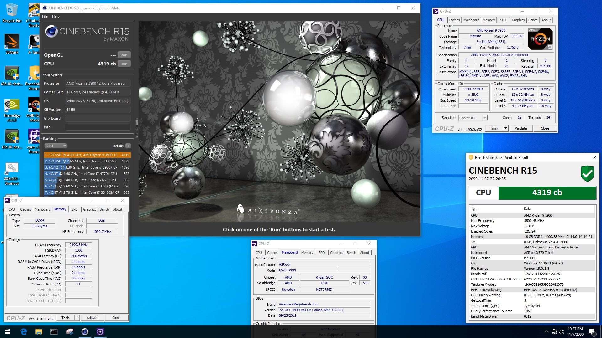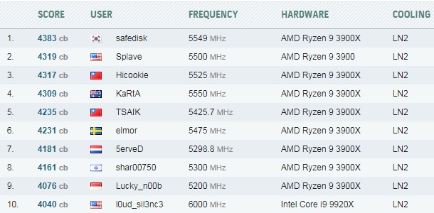 В конечном итоге процессор AMD Ryzen 9 3900 смог покорить частоту в 5,5 ГГц с активностью всех 12 ядер, набрав 4319 баллов в популярном бенчмарке Cinebench R15, что позволило ему занять почётное второе место среди всех моделей 12-ядерных процессоров.