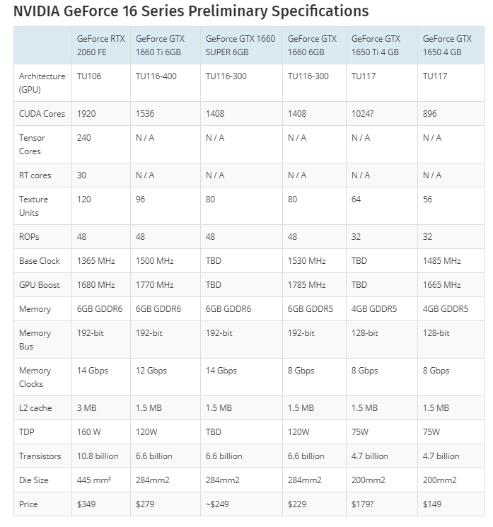 Можно было бы сказать, что NVIDIA находится в критическом положении и у нее все плохо, но ведь мы знаем, что очень скоро должны выйти видеокарты GeForce GTX 1660 SUPER и GTX 1650 Ti. Именно с ними будет бороться еще не анонсированная Radeon RX 5600. Итак, давайте внимательно рассмотрим таблицу предварительных характеристик обеих видеокарт зеленого лагеря.