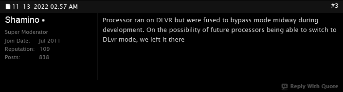 Shamino ответил, что Raptor Lake, по слухам должен был включать DLVR, но затем перед выпуском все процессоры были "переведены в режим обхода". Другими словами, Intel полностью физически отключила DLVR в настольных процессорах Raptor Lake. Shamino сообщает, что этот параметр был оставлен в BIOS в расчете на возможность поддержки гипотетических будущих процессоров с возможностью DLVR.