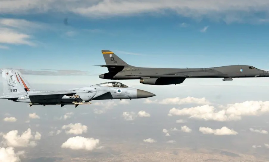 Тяжелый бомбардировщик ВВС США B-1b в сопровождении истребителя F-15 ВВС Израиля над воздушным пространством Израиля 30 октября 2021 года (Фотография предоставлена пресс-службой ЦАХАЛа)