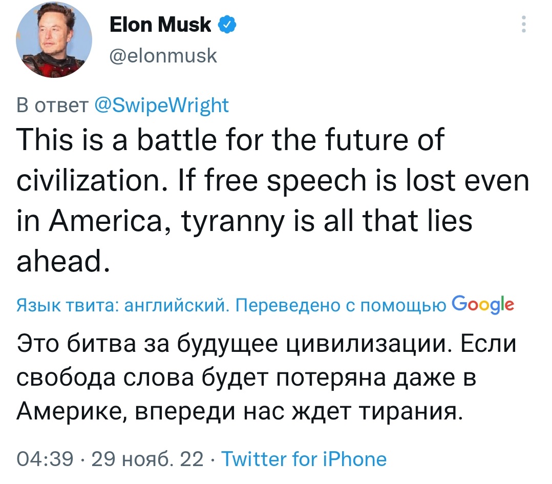 Как заявил Маск в своём Twitter, компания Apple сокращает свою рекламу в соц. сети, и есть опасения, что техногигант может вовсе удалить Twitter из своего магазина приложений, в связи с разблокировкой Дональда Трампа и других нерукопожатных, по мнению Apple, людей. Однако, Маск не сдаётся, написав, цитата - "Они ненавидят свободу слова в Америке?" Причем судя по всему новый владелец Twitter настроен серьезно, далее он опубликовал: "Это битва за будущее цивилизации. Если свобода слова будет утрачена даже в Америке, то впереди нас ждет только тирания".