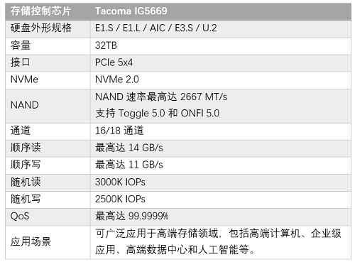 IG5669 позволит создавать твердотельные накопители различного форм-фактора объёмом до 32 ТБ с DDR5 буфером. Контроллер предлагает до 18 каналов памяти, в списке совместимости присутствуют не только хорошо известные типы NAND-флэш, такие как SLC, MLC, TLC и QLC, но и более экзотическая XL-FLASH, а также MRAM память. Среди поддерживаемых протоколов NVMe 2.0, NAND ONFI 5.0 и Toggle 5.0, также поддерживаются различные функции и алгоритмы шифрования, продвинутые механизмы исправления ошибок.