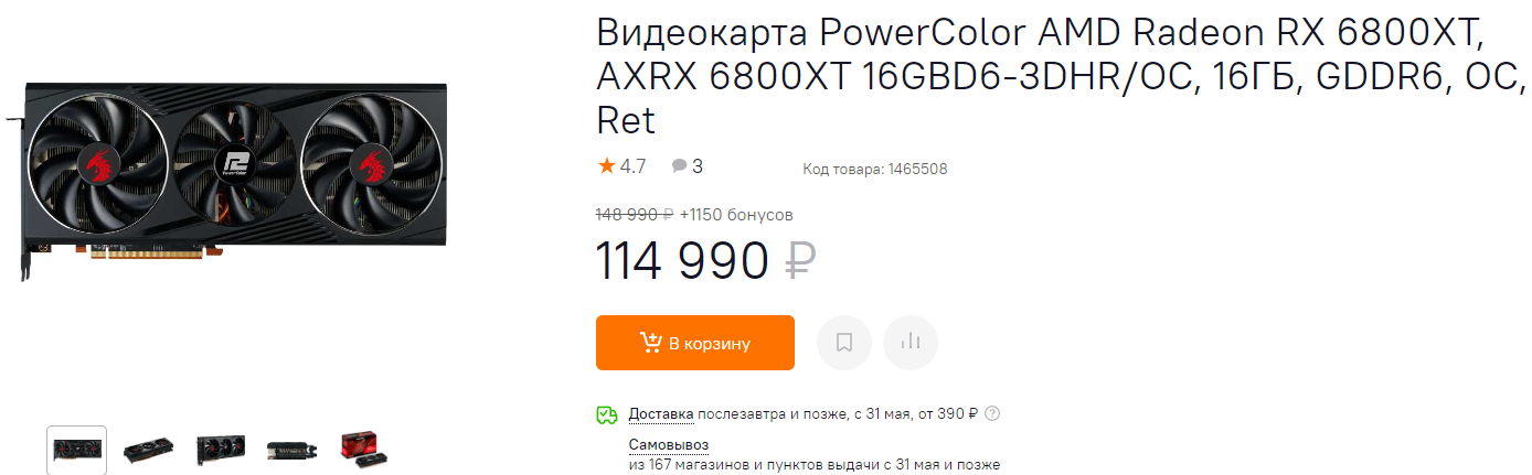 За 115 тысяч можно купить Radeon RX 6800 XT. Производительность здесь ниже, но чистая экономия не может не радовать. Вообще приходится признать, что в ходе очередного роста цен на видеокарты, продукция AMD пострадала минимально. Это значит, что вы можете смело брать аналоги флагманов NVIDIA не боясь потерять в скорости, получая намного больше чистой производительности за каждый потраченный рубль. Radeon RX 6800 XT тянет почти все игры в 4K@60fps на максимальных графических настройках.