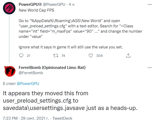 Спустя несколько дней Amazon успокоила игроков, выпустив патч, ограничивающий показатель fps, который, возможно, вновь перестал работать, поэтому специалисты PowerGPU рекомендуют собственноручно установить значение кадровой частоты: некоторым пользователям может помочь изменение параметра «90» в строке <Class name="int" field="m_maxFps" value="90" на «60», находящейся в файле «user_preload_settings.cfg» по пути «%AppData%\Roaming\AGS\New World», однако для свежей версии игры придётся найти файл user_preload_settings.cfg в папке «savedata» и произвести аналогичные манипуляции.