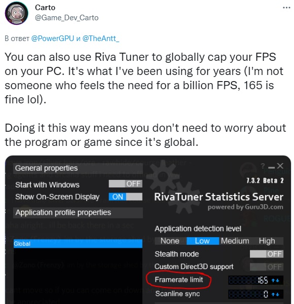 Для тех геймеров, которые не желают возиться с изменением файлов, имеется возможность ограничить fps при помощи сторонних приложений: например, энтузиаст под ником Carto рекомендует использовать утилиту RivaTuner.