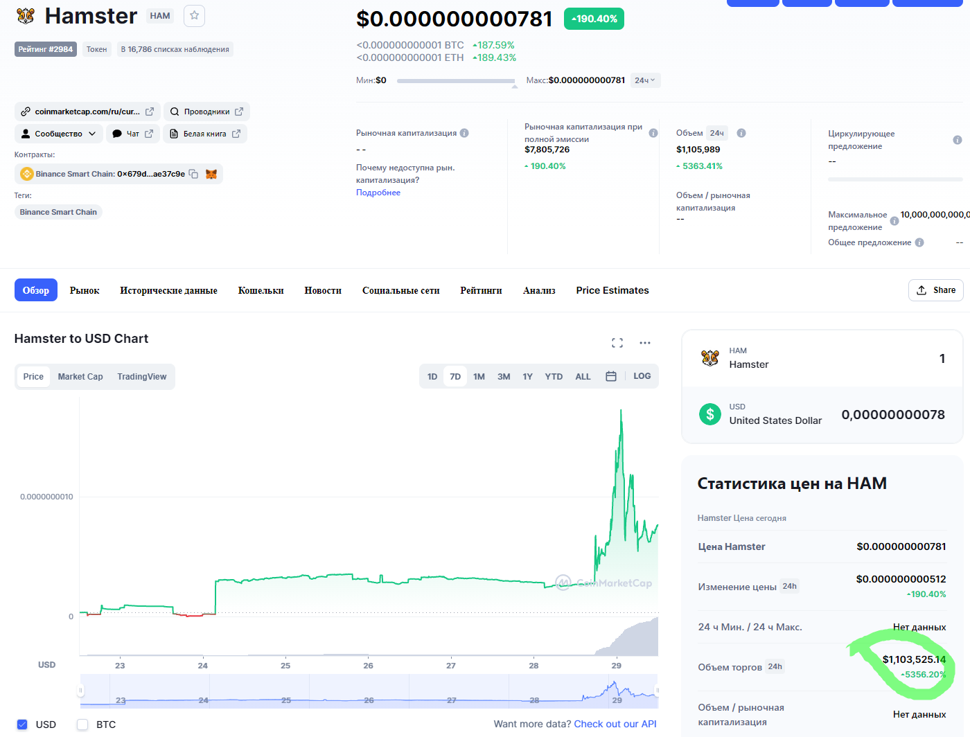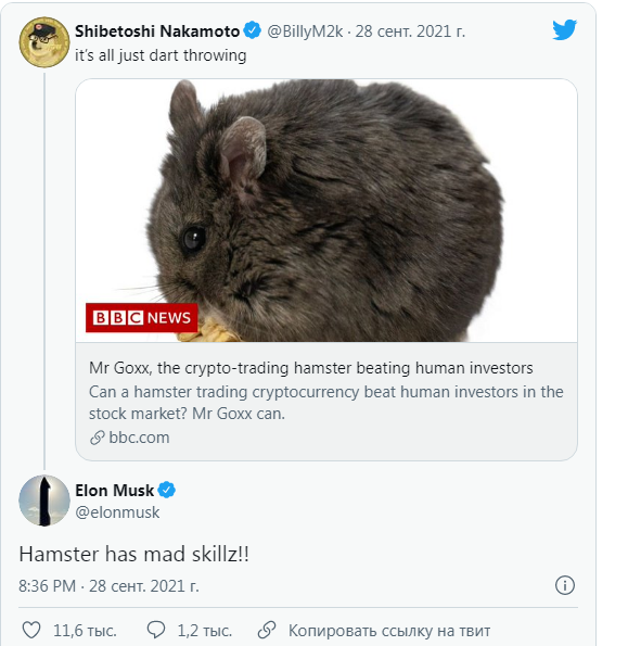 "У хомяка сумасшедшие навыки!!" - прокомментировал запись Илон. После этой записи в twitter стоимость токена Hamster взлетела более, чем на 500%, а суточный объём торгов отметился ростом на 5000% и приблизился к 1 миллиону долларов. Чуть позже Hamster, созданный на блокчейне Binance Smart Chain, откатился на 56% от максимума, но подзаработать кое-кто определенно успел.